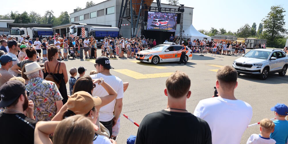 Schon zur Türöffnung um 10 Uhr standen erste Besuchende vor dem Eingang zum Polizeistützpunkt/Werkhof in einer Warteschlange. Kurz nach Türöffnung füllte sich das Gelände des Werkhofs, das dieses Jahr um das Areal der daneben ansässigen Prüfhalle des Strassenverkehrsamtes erweitert wurde, schlagartig. Anreisende mit ihren Fahrzeugen hatten sich bis um die Mittagszeit etwas in Geduld zu üben. Es kam zu kurzzeitigem Rückstau bis zum Autobahn-Anschlusswerk. Das riesige Parkhaus der Firma Fust, das für den Anlass freundlicherweise genutzt werden konnte, entschädigte dafür mit kürzester Gehdistanz zum Werkhof-Areal.
