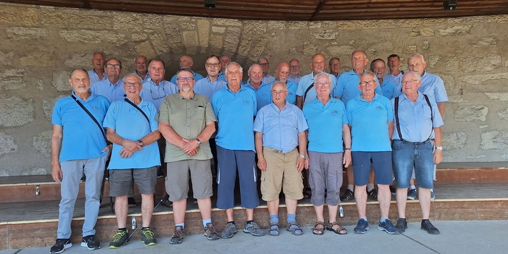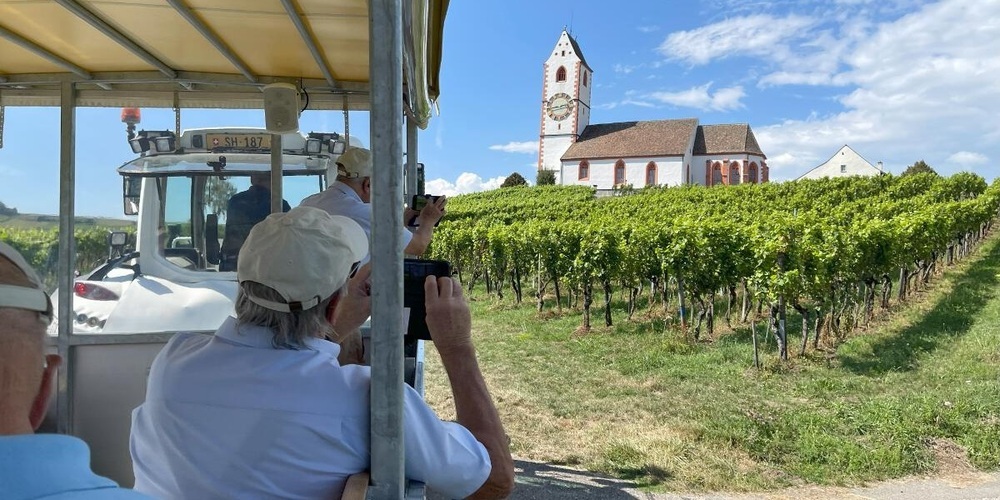 Bei schönstem Reisewetter bestiegen letzten Donnerstag 25 froh gelaunte Mitglieder des MännerSportvereins Gossau den Reisecar der Firma Ramsauer Herisau. Zuerst ging die Fahrt nach Pfyn, wo der Gruppe im bekannten Cafè Restaurant Bürgi Kaffee mit feinem Gipfel serviert wurde. Weiter ging es via Mammern, Stein am Rhein, Feuerthalen nach Hallau. Von der bekannten Bergkirche St. Moritz, wo Halt gemacht wurde, konnte der wunderbare Ausblick über die Gegend und die vielen Rebberge von Hallau genossen werden. Nach einem kurzen Fussmarsch hinunter ins Dorf wurden die Turner zum Mittagessen in Keller’s Winzerstube erwartet. Das sehr gute passende Essen mit Weinbergschüblig und Kartoffelsalat abgerundet mit feinem heimischem Wein war für alle ein Genuss. Anschliessend führte der Gastgeber die Teilnehmer mit dem «Rebenbummler» auf einer fast zweistündigen Fahrt durch die Rebberge von Hallau. Auf dieser interessanten Fahrt konnte viel über den Rebbau, die Landwirtschaft und den auch hier merklichen Bauboom erfahren werden. Auch die grossen Schäden an den Kulturen, verursacht durch die kürzlichen Unwetter wurden von allen wahrgenommen. Am Ende dieser informativen Fahrt hiess es wieder Abschied nehmen vom schönen Dorf Hallau.