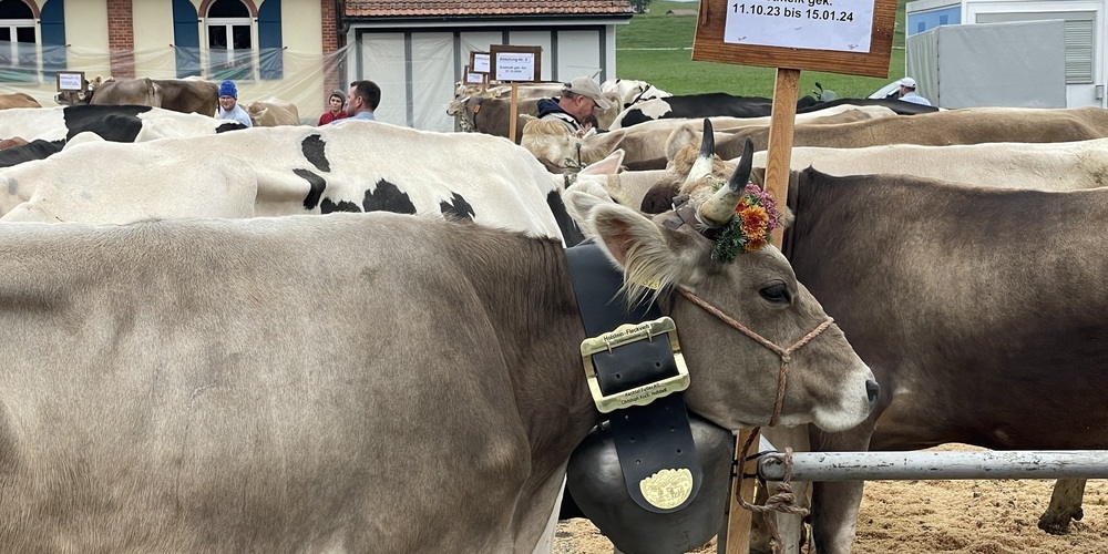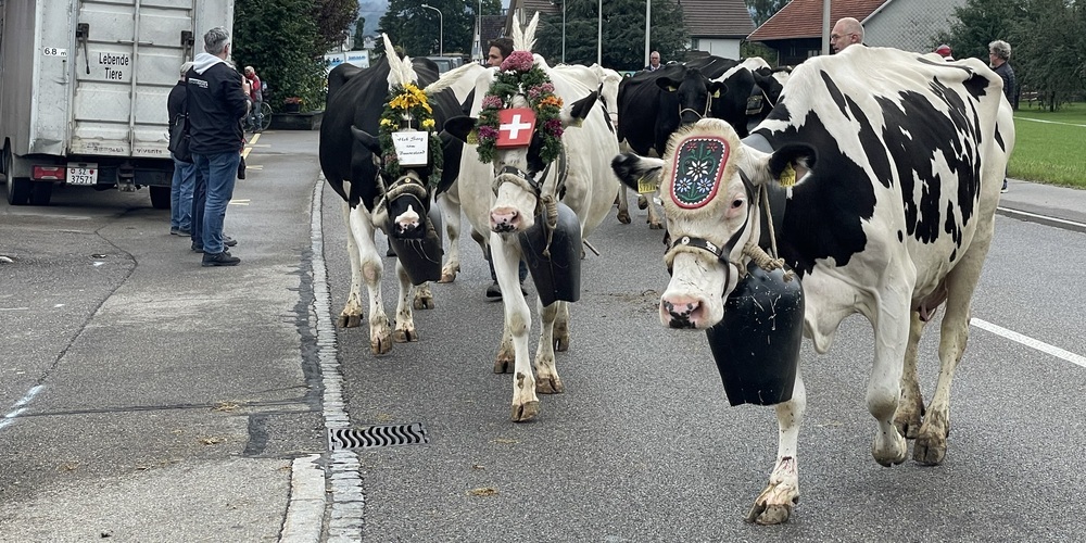 Es glöckelt und blümelt - die Zuschauer sammeln sich auf dem Gehsteig mit Blick zum Schützenhaus Niederdorf. Es ist 8:58 Uhr - und es ist kalt, fast winterlich. Nur 9 Grad Celsius zeigt das Thermometer. Die ersten Kühe trudeln ein. Es wird laut im Niederdorf - spätestens jetzt ist jeder wach.