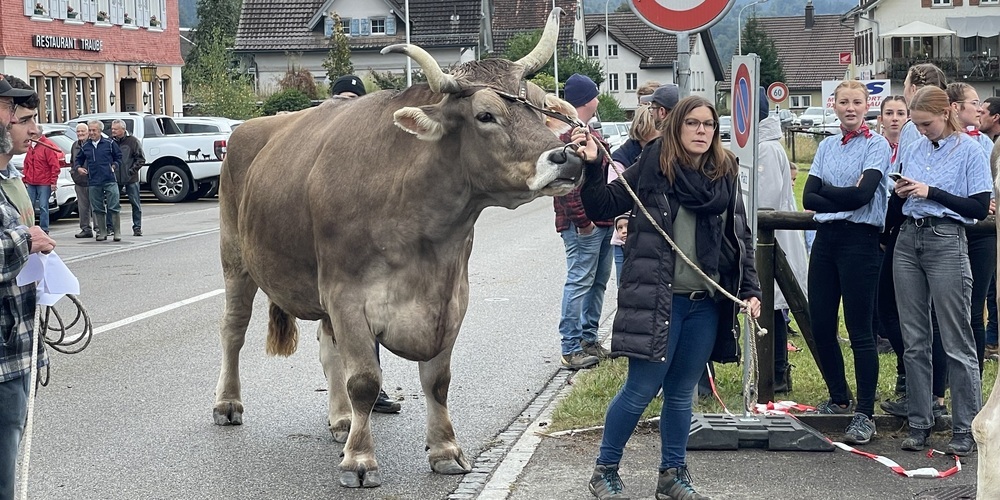 Bis 10 Uhr versammeln sich rund 200 Kühe. Zahlreiche von ihnen bunt geschmückt und mit grossen und mittleren Glocken behangen. Zwei Betriebe karren ihr Vieh mit dem Wagen an - der Rest kommt traditionell zu Fuss. Besonders auffällig sind die zwei grossen behornten Ochsen Peter (1200 Kilo) und Moritz (1300 Kilo) von Urban und Desireé Frey aus Höfrig. Die stattlichen Tiere muhen Munter beim Eintreten in die Niederdorf-Arena.