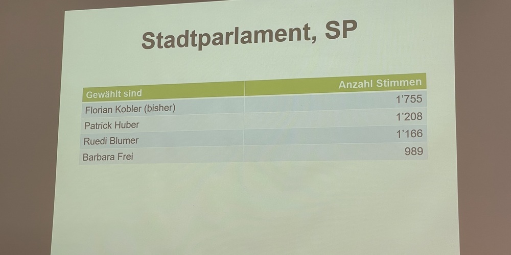 Personell erfährt die Legislative einige Veränderungen: Den zehnten Sitz der SVP wird Jan Mayer einnehmen. Bei der Mitte nimmt Simon Sigg neu im Parlament Einsitz - Angelo Schwizer und David Loser haben die Wiederwahl verpasst. Für die FDP wird neu Heinz Loretini im Parlament Einsitz nehmen - auf Kosten der Bisherigen Pakize Sönmez. Die SP-Fraktion erfährt einen Umbruch: Patrick Huber, Ruedi Blumer und Barbara Frei sind gewählt - Werner Bischofberger und Marco Broger verpassen die Wiederwahl. Bei der GLP-FLiG sind sämtliche vier bisherigen Fraktionsmitglieder wiedergewählt worden.