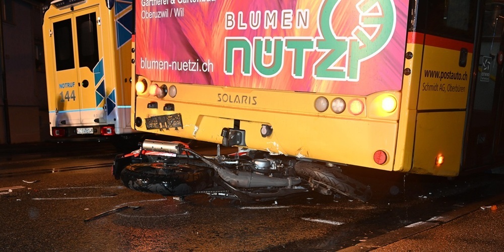 Gemäss bisherigen Erkenntnissen fuhr der 16-Jährige mit seinem Motorrad auf der Wilerstrasse von Gossau Richtung Oberbüren. Vor ihm fuhr das Postauto in die gleiche Richtung. Bei einer Haltestelle hielt das Postauto an, um Passagiere aussteigen zu lassen. Aus unbekannten Gründen kam es dabei zur Kollision zwischen dem Motorrad und dem Postauto, wobei der 16-Jährige mit dem Motorrad mutmasslich zu Fall kam, unter das Heck des Postautos rutschte und dort eingeklemmt wurde. Er musste von der Feuerwehr befreit werden. Anschliessend brachte ihn der Rettungsdienst mit schweren Verletzungen ins Spital. Am Motorrad sowie am Postauto entstand Sachschaden im Wert von rund 10'000 Franken.