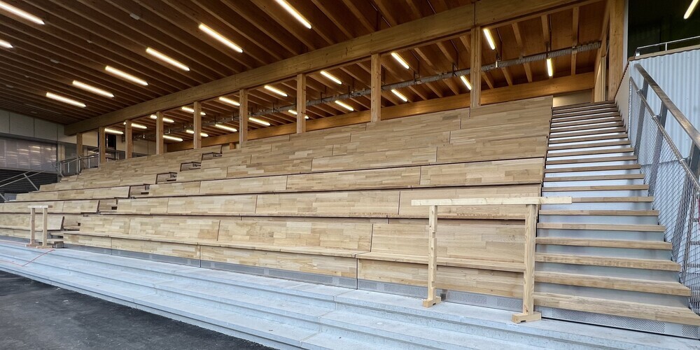 Die neue Tribüne aus Eichenholz bietet 600 Sitzplätze und umfasst zudem weitere Stehplätze. Im Innern des Tribünengebäudes befinden sich die Garderoben für die Teams und Schiedsrichter, ein Club-Beizli, das auch an andere Vereine vermietet wird, ein Mehrzweckraum sowie Technikräume. Auffallend ist die Farbgebung in den Garderoben, Toiletten und auch in der Küche des Club-Beizlis. «Das Gelbgrün bildet einen tollen Kontrast zu den blauen Trikots der Spieler», erklärt Yvo Lehner.