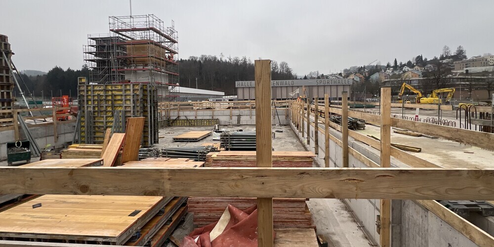 Die Bauarbeiten für das neue Hallenbad haben vor knapp einem Jahr begonnen. Fast ein halbes Jahr lang war man mit den Werkleitungen beschäftigt. Eine grosse Herausforderung war das Auspumpen des Grundwassers. Nun ist man an den Baumeisterarbeiten, die im Frühling fertiggestellt sind. Danach kann aufgerichtet werden. Die Eröffnung des Hallenbads Buechenwald ist für den Frühsommer 2026 geplant.