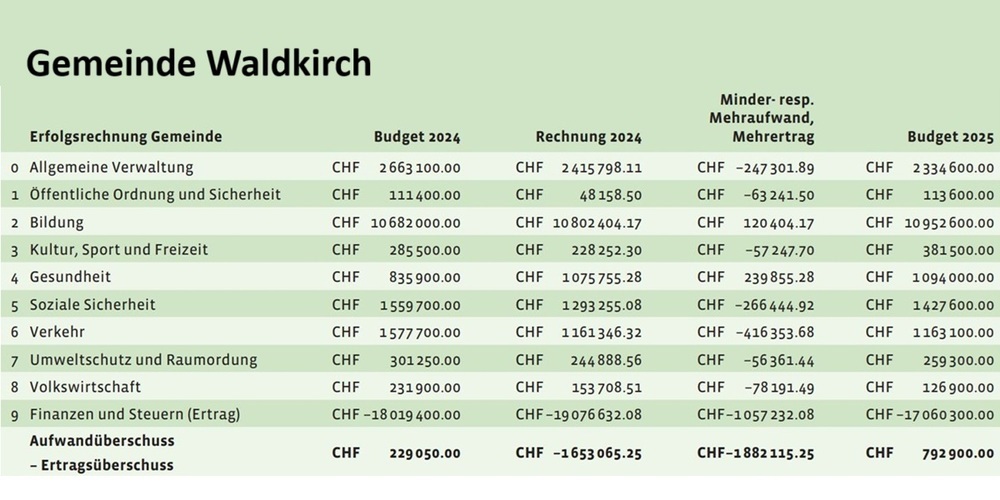 Das Budget 2025 weist bei der Erfolgsrechnung einen Ertragsüberschuss von Fr. 3 100.00 aus. Dies bei einem Gesamtaufwand von neu Fr. 5 410 600.00 (gegenüber dem Jahr 2024 mit Fr. 6 909 300.00) und einem budgetierten Ertrag von Fr. 5 413 700.00 (Vorjahr Fr. 6 740 600.00).