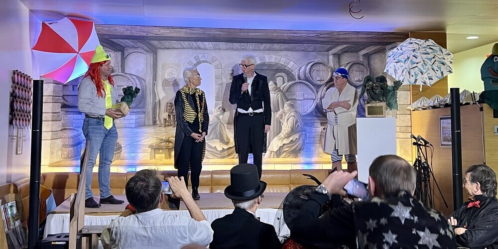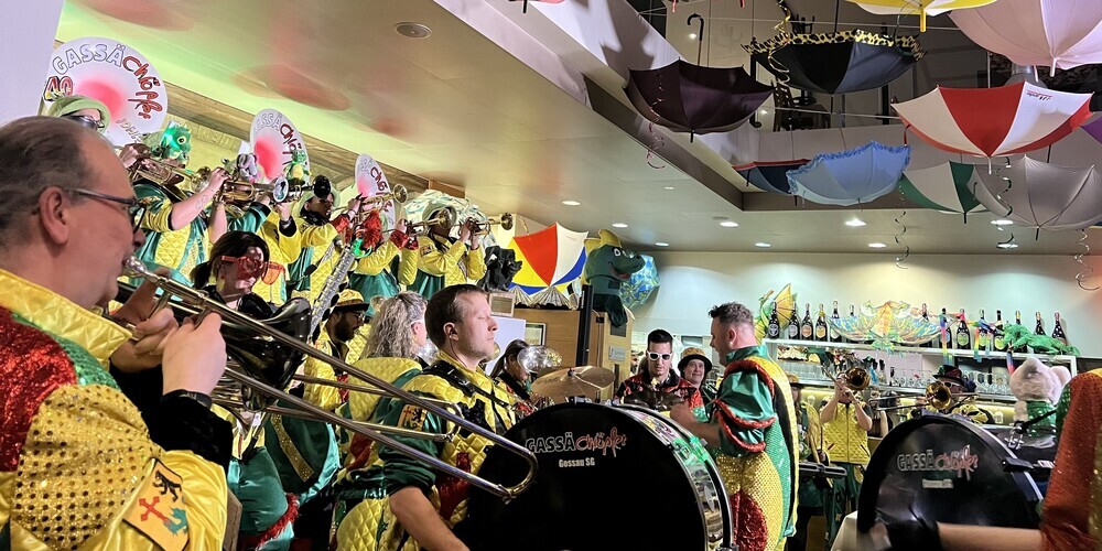 Moderator Stefan Häseli führte mit Leichtigkeit und viel Humor durch den Abend. Beste Unterhaltung boten die Gassächlöpfer, DJ Beat und vier Schnitzelbanken. Der Saal war bis auf den letzten Platz besetzt und der grösste Teil des Publikums erschien zu diesem Anlass kostümiert. Zusammen mit den vielen bunten Schirmen an der Decke ergab sich an diesem Abend im Freihof ein buntes und fröhliches Bild.