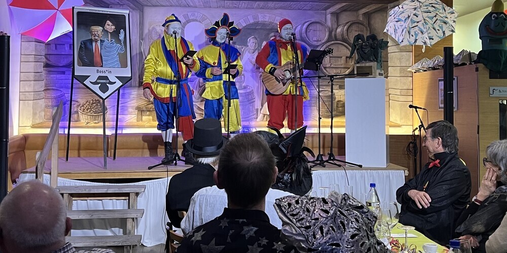 Die vier Schnitzelbanken unterhielten den vollen Saal mit frechen Reimen und spitzer Zunge: So nannten die «Emanzen mit Ranzen» aus Bürglen Gossau einen Vorort von Flawil. Die Thurgeier aus Bischofszell fanden, Markus Ritter hätte genug Kenntnisse, um «einen Stall auszumisten». Die «Zwei Räppler» rissen das Publikum mit ihrem Gossauer Fasnachts-Rap mit und behaupteten, es gebe einen neuen Roman von Jules Verne: In 80 Tagen vom Zentrum in die Stadt. Die Herisauer «Trumpf Buur» schliesslich fanden, diejenigen, die sich bei der AHV so verrechnet hätten, könnten eigentlich in Pension gehen. «Die AHV können sie dann von uns berechnen lassen!» Auffallend beliebt waren die Themen Trump, Gendern und die Jubiläumsbänkli von Gossau.