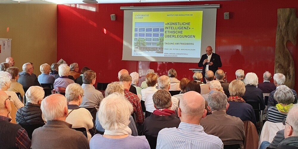 Am Samstag nach Aschermittwoch, 8. März 2025, fand die Tagung am Friedberg zum hochaktuellen Thema "Künstliche Intelligenz – ethische Überlegungen" statt. Rund 100 interessierte Personen nahmen daran teil und verfolgten mit grosser Aufmerksamkeit den Vortrag von Prof. Dr. Peter G. Kirchschläger, Ordinarius für Theologische Ethik und Leiter des Instituts für Sozialethik an der Universität Luzern sowie Gastprofessor am ETH AI Center.
