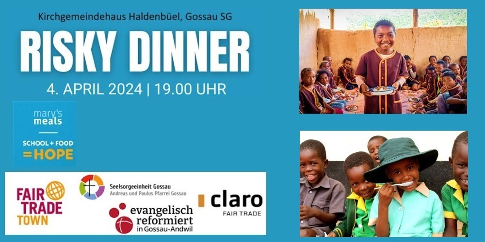 Die Essensverteilung wird für viel Gesprächsstoff sorgen, ebenso die Info-Blöcke, welche vom Hilfswerk Mary’s Meals gestaltet werden. Mary’s Meals versorgt weltweit über 2 Millionen Schulkinder mit einer Mittagsverpflegung. Der Gewinn vom Risky Dinner gehört denn auch diesem Hilfswerk.