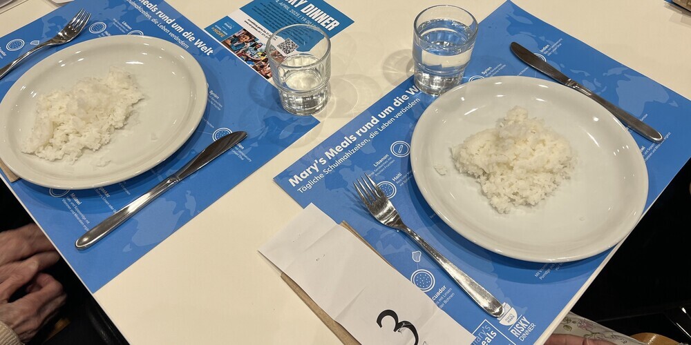 Zu Beginn des Abends zogen alle Anwesenden ein Los. Dieses entschied darüber, was sie an diesem Abend essen konnten: Rund 20 Prozent erhielten ein Fünfgangmenü mit Wein am Tisch serviert. Für rund einen Drittel gab es einen Teller Spaghetti und alle anderen – also die Hälfte – stellten sich für einen Teller Reis an. Das Wasser mussten sie sich draussen selbst holen. Und da die nächste Quelle leider versiegt war, wie Raphaela Staiger von Mary's Meals mitteilte, mussten sie dafür sogar noch etwas weiter gehen.