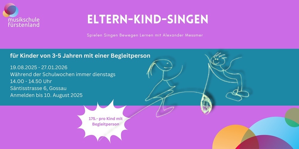 Im Eltern-Kind-Singen der Musikschule Fürstenland führt Alexander Messmer die Jüngsten mit viel Leidenschaft, Sorgfalt und Witz in die Welt der Musik ein. Im Kurs interagieren die Kinder teilweise das erste Mal in einer grösseren Gruppe. Kinder und ihre Begleitpersonen lernen Lieder und Verse, welche neben dem Erwerb von musikalischen Grundlagen insbesondere auch der Sprachentwicklung zugutekommen. Nutzen und geniessen Sie die gemeinsame Aktivität mit ihrem Kind und ermöglichen Sie ihm den Einstieg ins Musizieren, welches Menschen von jung bis alt positiv bestärken kann.