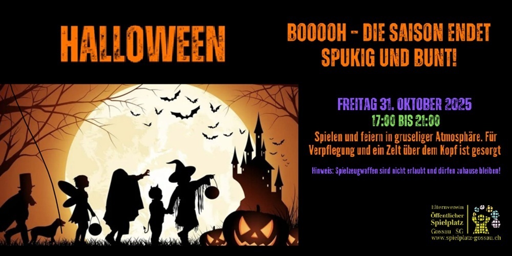 Wenn auf dem öffentlichen Spielplatz in Gossau am 31. Oktober zwischen 17 und 21 Uhr gruselige Gestalten, leuchtende Kürbisse und fröhliches Kinderlachen zu sehen und hören sind, dann ist wieder Halloween-Zeit. Der Elternverein Öffentlicher Spielplatz Gossau lädt Gross und Klein herzlich zur beliebten Halloween-Party ein. Ob Hexe, Vampir oder Superheld – Verkleidungen sind willkommen, Spielzeugwaffen bleiben bitte zu Hause.