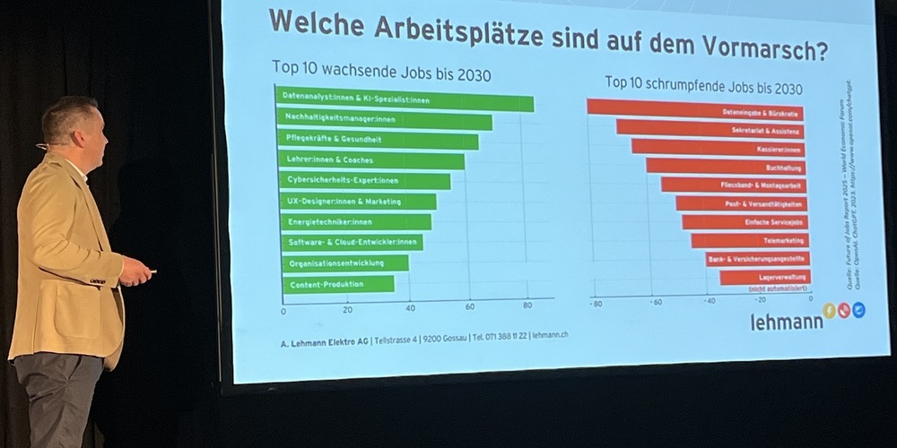 Anschliessend stellte er ein paar KI-generierte Statistiken zum demografischen Wandel, den zunehmenden Fachkräftemangel sowie der Digitalisierung und Auswirkungen auf den globalen Arbeitsmarkt vor. «Die gesamte Arbeitswelt wird zunehmend digitaler, flexibler und ortsunabhängiger – virtuelle Teams, lebenslanges Lernen und der «War for Talents» werden dabei bis 2030 weiter an Bedeutung gewinnen.» Zudem würden Berufe wie Datenanalysten oder KI-Mangager immer gefragter werden – Dateneingabe, Sekretariats- und Assistenzstellen hingegen würden auf Grund des Einsatzes von KI obsolet.