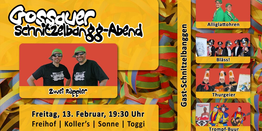 Der Gossauer Schnitzelbangg-Abend ist seit Jahrzehnten ein fester Bestandteil der lokalen Fasnacht. Seit über 30 Jahren verdichten die «Zwei Räppler» aktuelle Ereignisse aus Politik, Sport und Gesellschaft in ihren Fasnachts-Rap und ihre abstrusen Rätsel-Helgen. Auch dieses Jahr sind sie wieder in Gossau unterwegs. Ergänzt wird das Programm traditionsgemäss durch Gast-Schnitzelbanggen aus der Region: die «Alliglattohren» aus Flawil, «Bläss!» aus dem Appenzellerland, die «Thurgeier» aus Bischofszell sowie der «Trompf-Buur» aus Herisau.